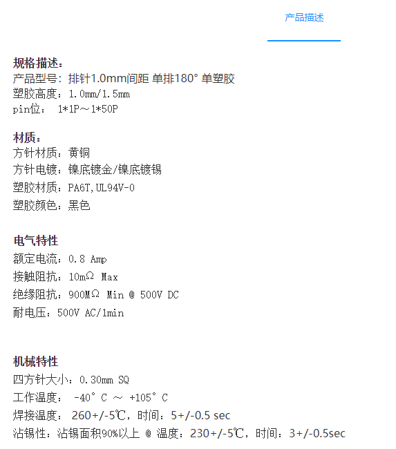 1.0mm间距排针连接器-单排180° 双塑胶