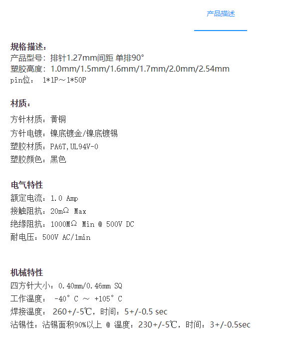 1.27mm间距排针连接器 单排SMT 单塑胶