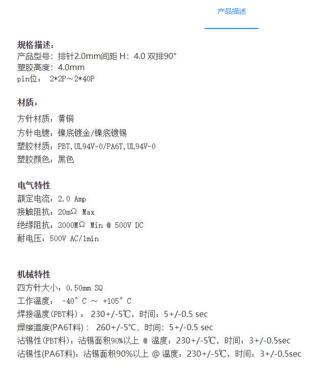 2.0mm间距排针连接器-H:4.0_双排90°