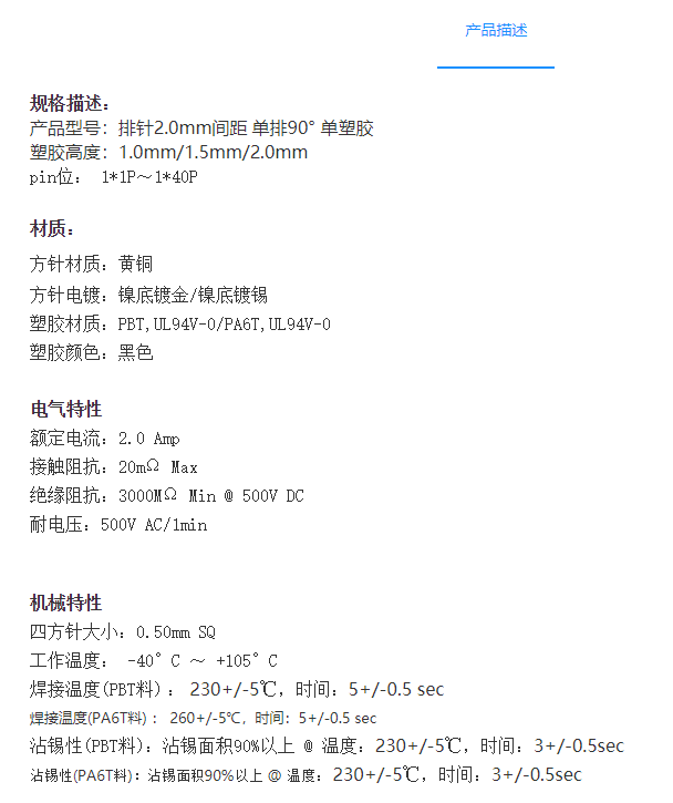 2.0mm间距排针连接器-单排90° 两侧带塑胶