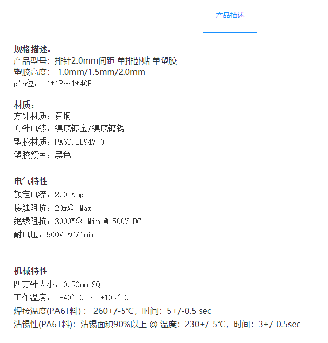 2.0mm间距排针连接器-单排卧贴_单塑胶