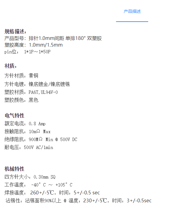 1.0mm间距排针连接器-单排180° 双塑胶