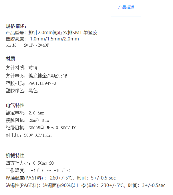 2.0mm间距排针连接器-双排卧贴_单塑胶