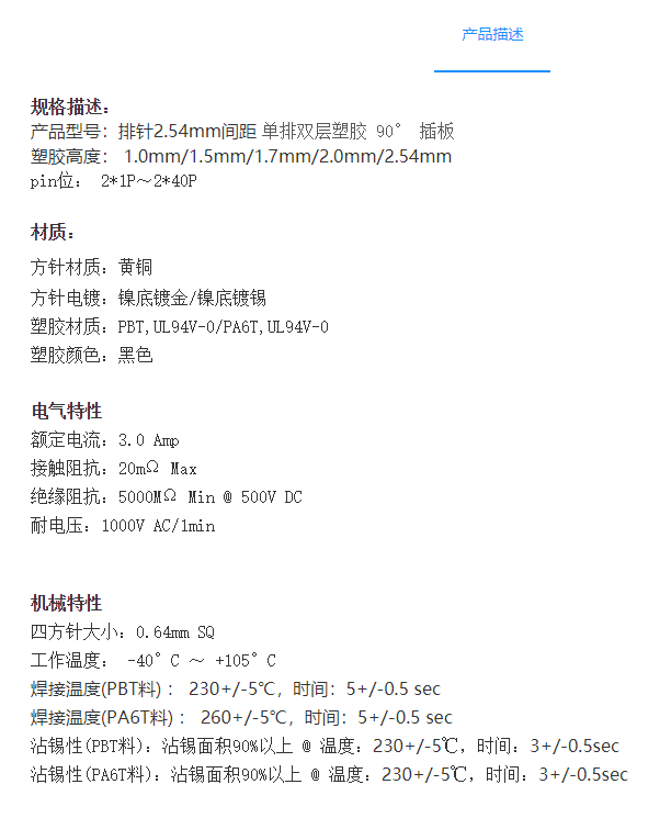 2.54mm间距排针连接器 单排双层塑胶 90° 插板
